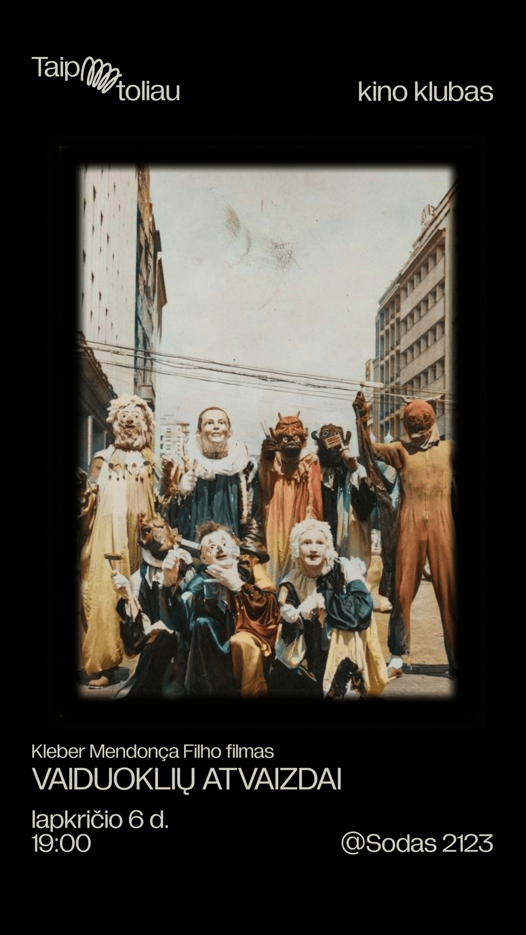Po Brazilijos kino kritiko ir režisieriaus Kleber Mendonça Filho filmų GARSAI KAIMYNYSTĖJE (Neighboring Sounds, 2012) ir VANDENIS (Aquarius, 2016) peržiūrų, pirmuosius Taip toliau kino klubo metus užbaigsime naujausio jo filmo premjera. VAIDUOKLIŲ ATVAIZDAI (Pictures of Ghosts, 2023) – tai jaudinantis ir žaismingas trijų dalių pasakojimas persmelktas meile kinui ir tyrinėjantis ištuštėjusias, tačiau prisiminimų prisodrintas erdves. Visi šie filmai kartu sudaro tam tikrą triptiką apie Recifę – gimtąjį Mendonça Filho miestą, kuriame piešiamas kompleksiškas Brazilijos visuomenės būklės paveikslas su jame tūnančiais istorijos vaiduokliais.