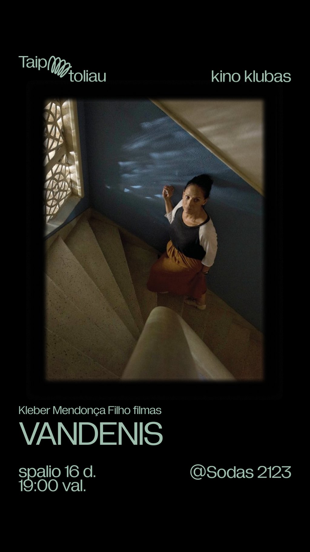 Spalio 16 d. @SODAS2123 žiūrėsime ir aptarsime VANDENĮ. Kaip ir pirmajame filme, taip ir čia, viename iš Recifės daugiabučių vyksta permainos. Svarbų vaidmenį ir vėl atlieka pats pastatas – kadaise nuostabus viduriniosios klasės kompleksas su vaizdu į vandenyną, pavadinimu Vandenis. Jame aidintys garsai, jo architektūrinė struktūra ir interjeras kuria istoriją kaimynystės, kurioje liko tik paskutinė gyventoja.